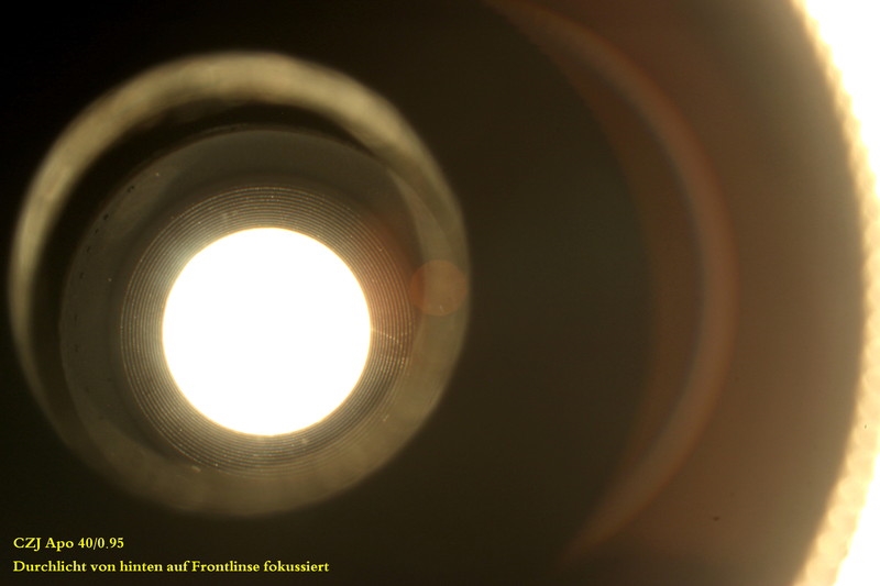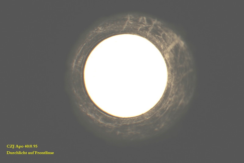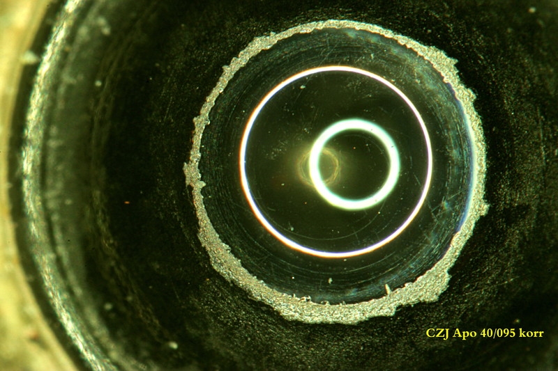 Mit dem PH-Fernrohr sieht man ganz am Rand eine kleine Blasenreihe. Ich habe leider keinen Optovar für CZ, deshalb habe ich mir das Objektiv mit dem Stemi angeschaut. Die Frontlinsen-Kalotte zeigt am Rand kleine Abplatzer und darunter verschwommen diffuse Blasen. Von hinten im Durchlicht leicht verkippt sind schöne Blasen am Rand zu sehen. Schaut man senkrecht durch - sowohl von hinten, als auch von vorne - gibt es nichts Auffälliges!