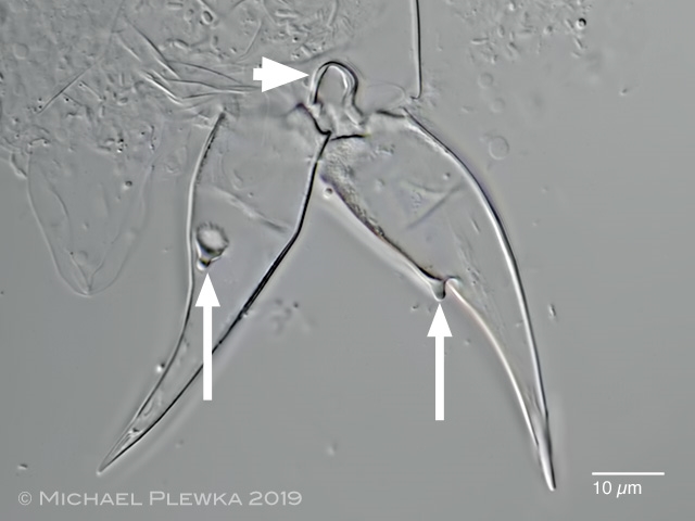 Eine relativ  seltene Rädertier-Art (gemessen daran, wieviel google-Einträge man dazu findet) habe ich auch gefunden: Cephalodella stenroosi. Diese Rädertier-Art  kann man leicht für C. forficula verwechseln, weil sie im Habitus ziemlich ähnlich ist, insbesondere die charakteristische sichelförmige, nach dorsal gerichtete Form der Zehen ist identisch; allerdings sind die Auswüchse an den Zehen bei beiden Arten sowie andere Merkmale unterschiedlich. Hier der Fuß/Zehen (die Auswüchse sind durch Pfeile markiert) von einem mazerierten Exemplar: