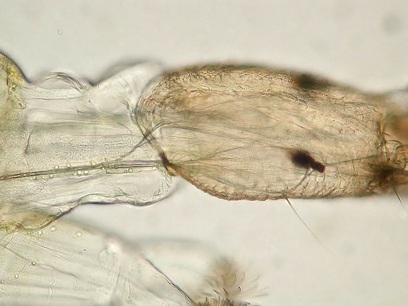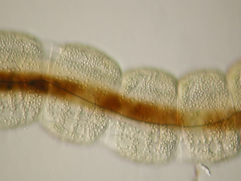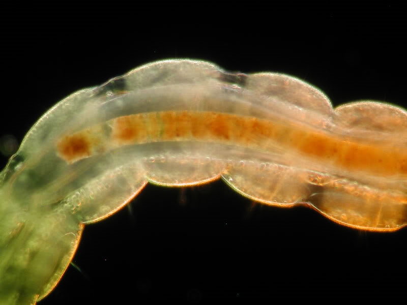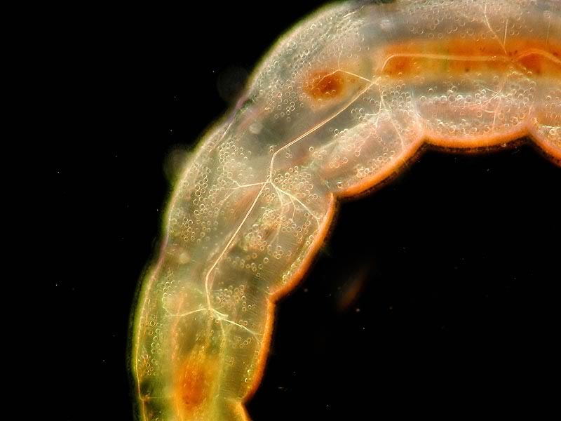 die roten Larven der Zuckmücke findet man im Moment ja reichlich. Diese hier lag sozusagen in den letzten Zügen und bot reichlich Gelegenheit sich fotografisch etwas auszutoben. Im folgenden also einige Studien in verschiedenen Beleuchtungen. Es kamen zum Einsatz HF, schiefe Beleuchtung, Phasenkontrast und DF (dieses wurde mit einem Grün/Orange Kombifilter koloriert, so eine Art Rheinbergbeleuchtung könnte man sagen. Man erkennt sehr schön das verzweigte Nervensystem, einige Thorax-und Abdominalsegmente mit Darm, sowie zahlreiche Globuli, von denen ich nicht sicher bin, ob es Öl- oder eventuell Hämoglobintröpfchen sind.
