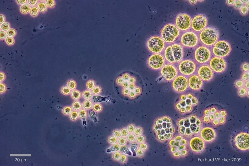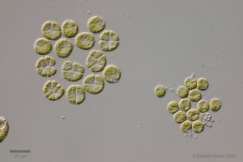 Links Gonium pectorale bei der vegetativen Vermehrung. Die einzelnen Zellen des Gonium Verbundes sind in unterschiedlichen Teilungsstadien auf dem Wege zur 16 zu sehen. Rechts der Parasit bei der Arbeit.