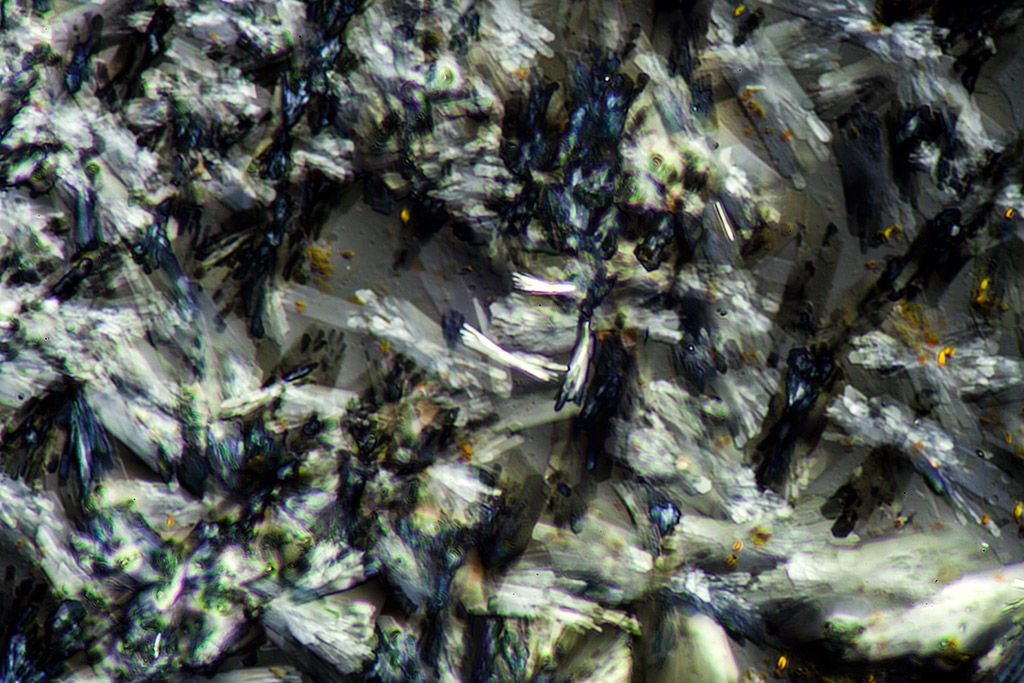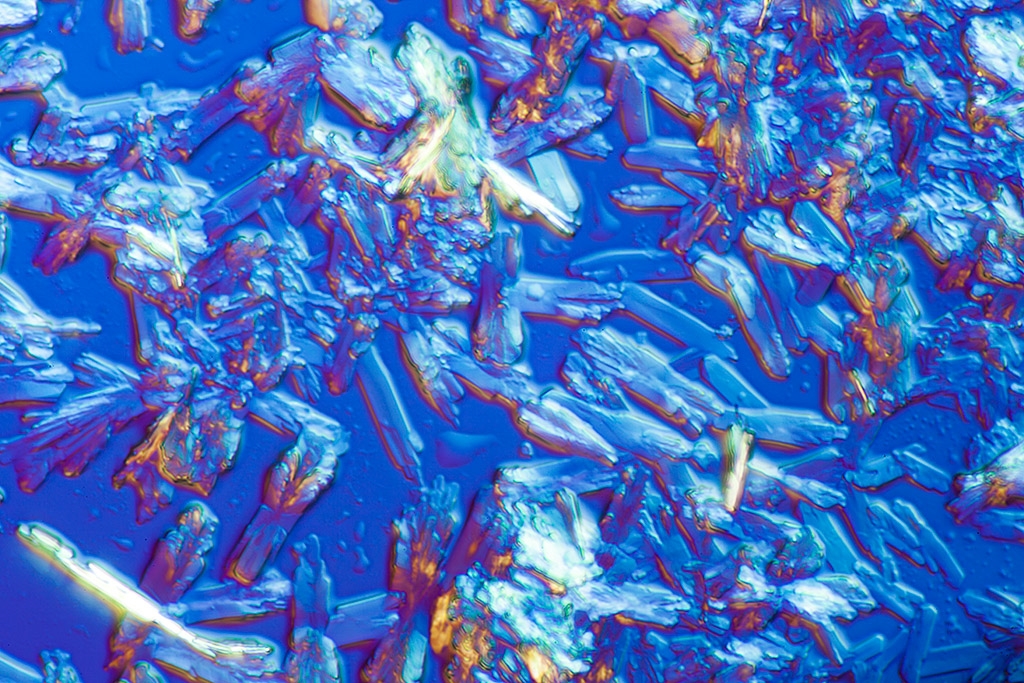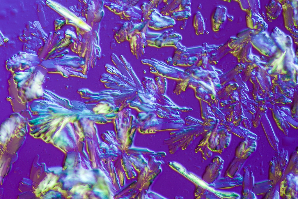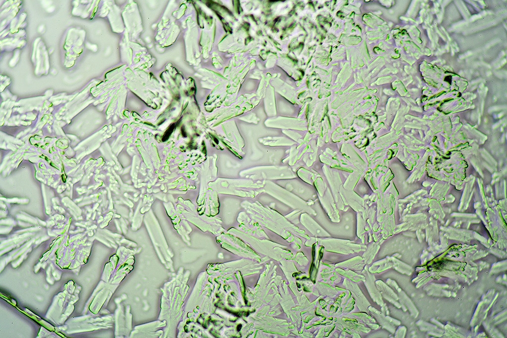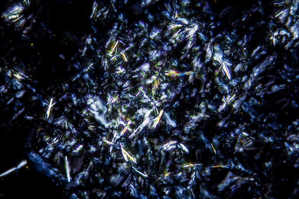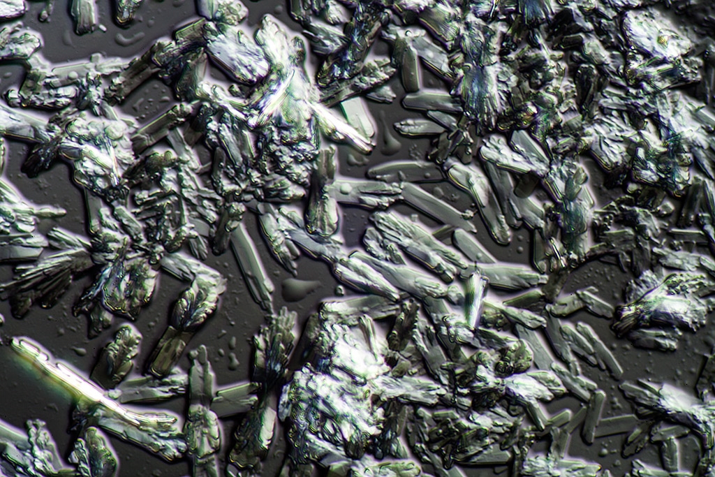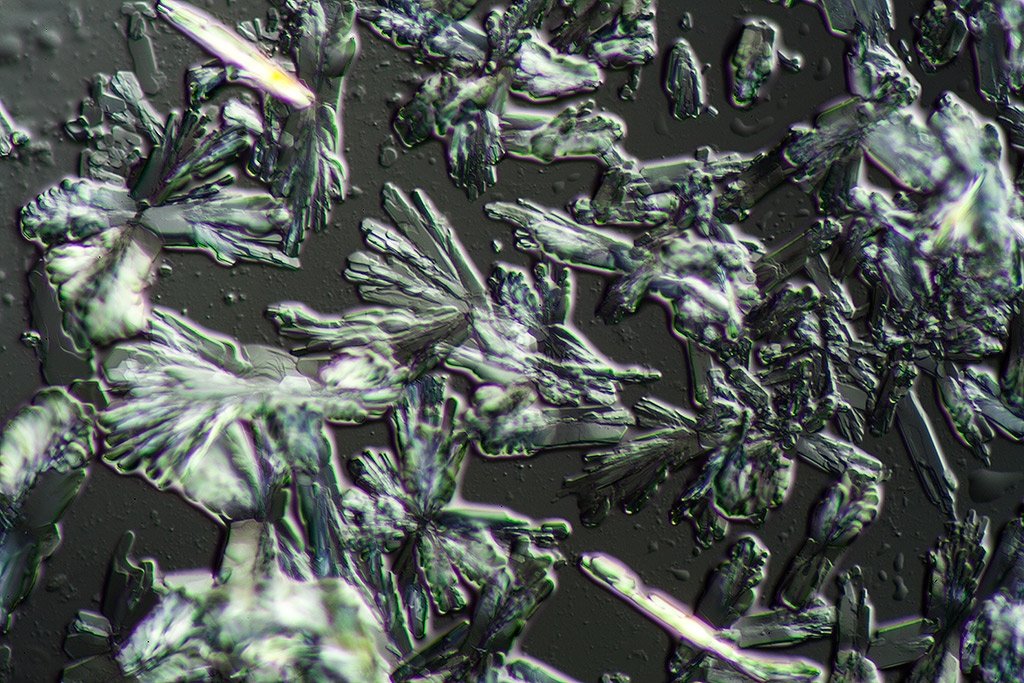 Das ist der zweite untaugliche Versuch, Capsaicin aus einer Habanero-Chilischote auskristallisieren zu lassen. Aufnahme im DIC, Objektiv 40x, ohne Deckglas.