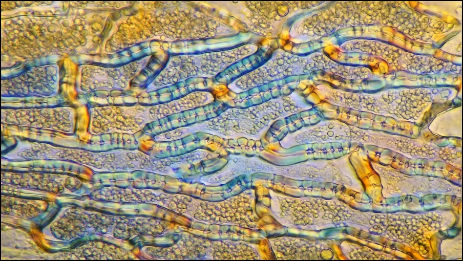 Nun, im Präparat gibt es schon ein paar wenige orangefarbene Einsprengsel, aber insgesamt überraschend wenige.