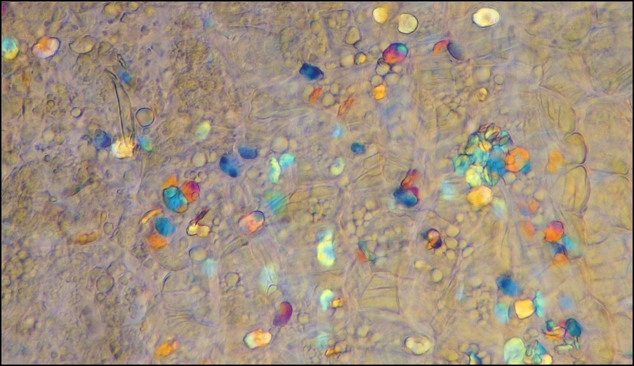 Im Innern der Chili-Fruchtschale, da, wo die Scheidewand die Samen nährt, finden sich Öltröpfchen, teilweise kristallisiert (doppelbrechend), die das Capsaicin enthalten: