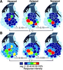 Bedeutsam ist aber auch der Antennallobus, Schon in dieser einfachen Azanfärbung kann man ein wenig erkennen, dass er aus mehreren kleinen rundlichen Knäueln des Neuropils, den Antennalglomeruli AG besteht. Kurz vor Erreichen des Antennallobus spaltet sich auch erkennbar der Antennennerv auf. Der Grund dafür liegt darin, dass die einzelnen Nerven von verschiedenen Rezeptoren auf der Antenne herrühren, die jeweils von verschiedenen Glomeruli im Antennallobus repräsentiert werden. Aus diesem Grunde lässt sich auch nachweisen, dass bei verschiedenen Gerüchen verschiedene Glomeruli aktiviert werden. Diese Aktivierung lässt sich sogar sichtbar machen, so dass verschiedene Stoffe im Antennallobus gewissermaßen kartiert werden. Im Netz gibt es hierzu ein schönes Beispiel vom Antennallobus der Honigbiene. Verschiedene Kohlenwasserstoffe zeigen unterschiedliche Erregungsmuster im Lobus: