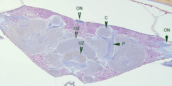 Zentral oben aufgelagert ist ein Nerv ON, der von den Ocellen herrührt und der erst später ins Gehirn gelangt, rechts daneben sieht man außen einen kleinen Kreis, eine quer geschnittene Trachee zur Sauerstoffversorgung. C und P sind zwei Strukturen, die zum Pilzkörper gehören, nämlich C kelchartig der Calyx auf einem massiv ausgeformten Stiel, dem Pedunculus. Diesen Strukturen werden die Lern- und Gedächtnisfunktionen der Insekten zugeschrieben.