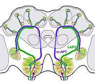 Von den Antennallobi steigen verschiedene Nervenbahnen, sogenannte Trakte auf, von denen hier im Schnitt ein innerer Antennentrakt IAT zu sehen ist. Er läuft unter anderem zu den Kelchen der eben besprochenen Pilzkörper.