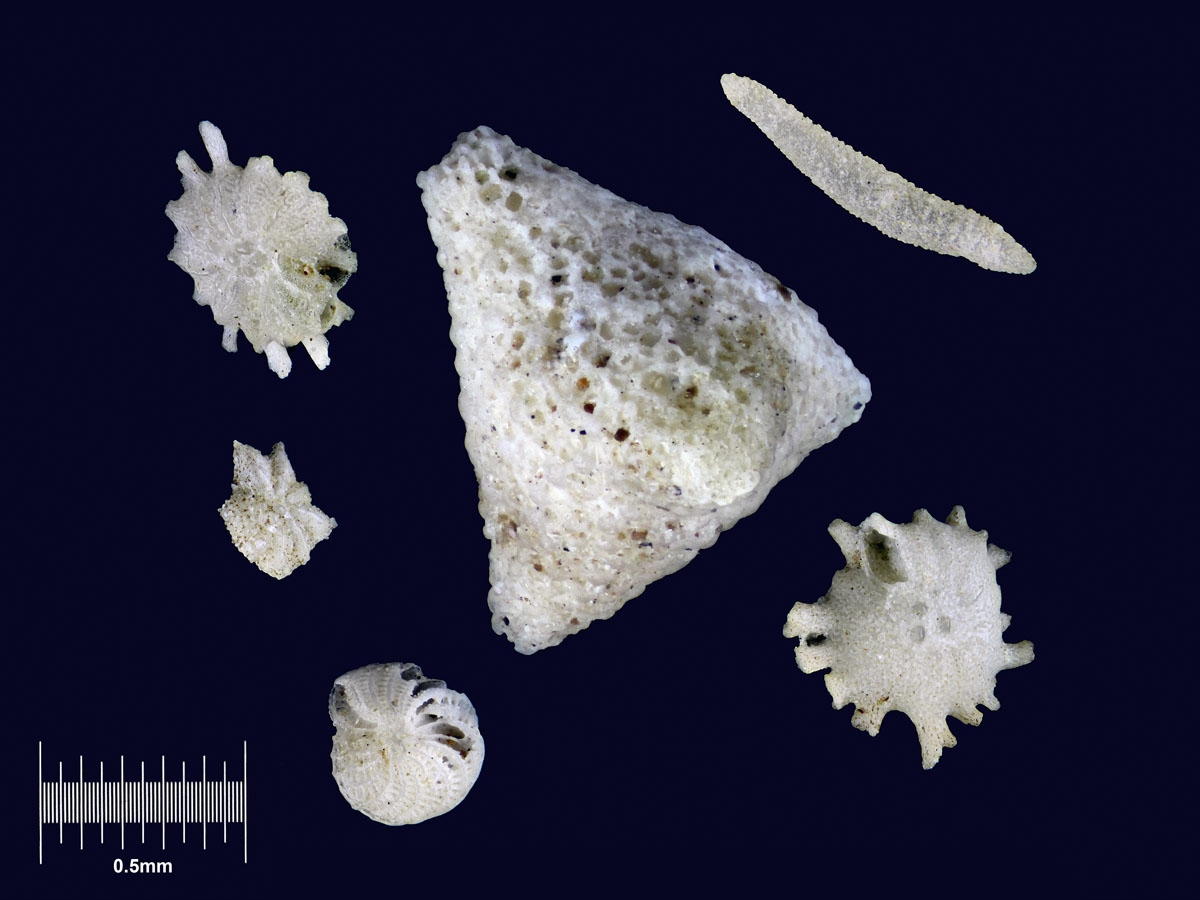 Beim ersten Bild rechts oben meine ich eher eine Spicula und im 2 Bild oben Mitte ein Seeigelstachelgelenk und links unten eine Schnecke zu identifizieren.