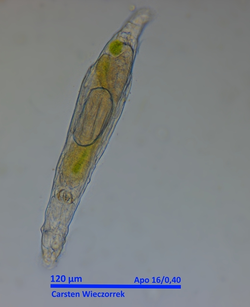 Bild 3 und 4 : Rädertier. Grün und braun. Hat das in den wenigen Stunden schon gefressen oder trocknen die mit vollem Magen ein?