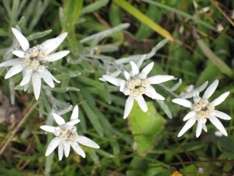 Das Edelweiß ist vermutlich kein "echtes" (?), ich fand es zwar auf 1700m am Wegesrand. Man kann es aber in Gärtnereien in einem Topf kaufen. Wie es dort oben hingekommen ist, weiß ich nicht. Sie standen inmitten einer Kolonie "Gewöhnliche Wucherblume"  (leucanthmum vulgare).