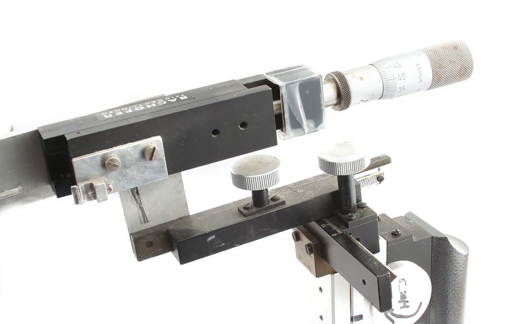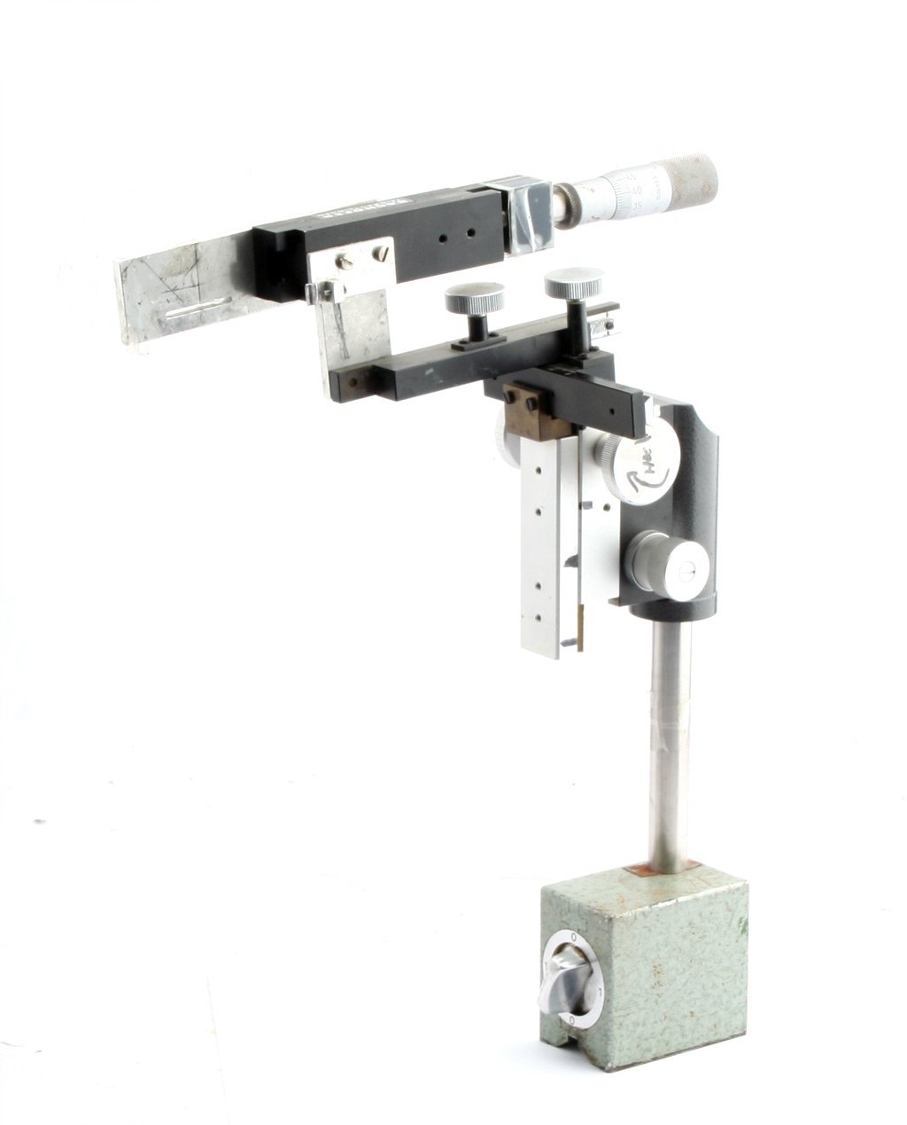 Eine durch Grob- und Feintrieb höhenverstellbare Vorrichtung. Ein aufgeschraubter Kreuztisch erlaubt eine Verstellung in x/y und die mit Federgegenlager geführte Mikrometerschraube macht den Vorschub.