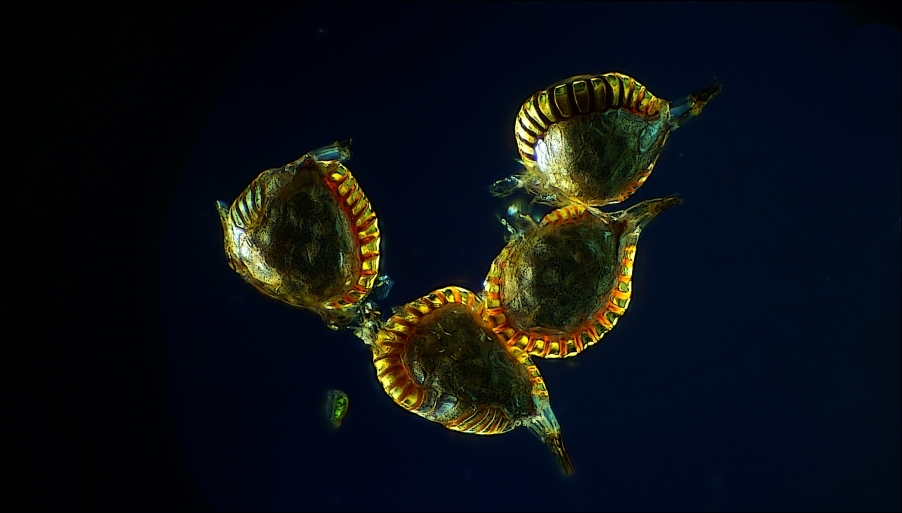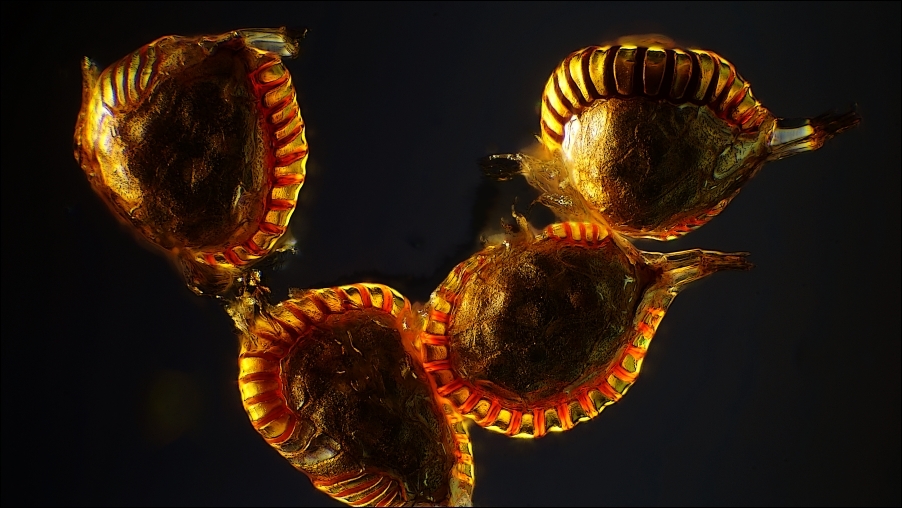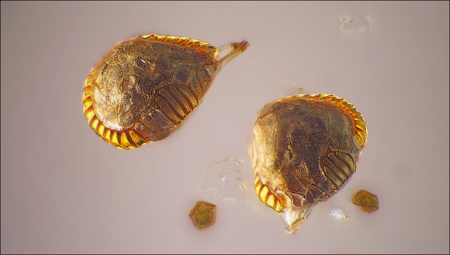 die Sporangien des Strauß(en)farns entsprechen in etwa denen, die hier in letzter Zeit öfter vorgestellt wurden. Die noch gefüllten Kapseln sind nicht transparent. Daher mein Versuch, Pol-Durch- mit Auflicht zu kombinieren: