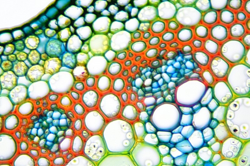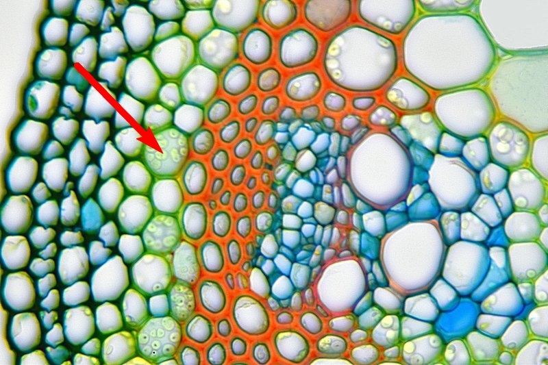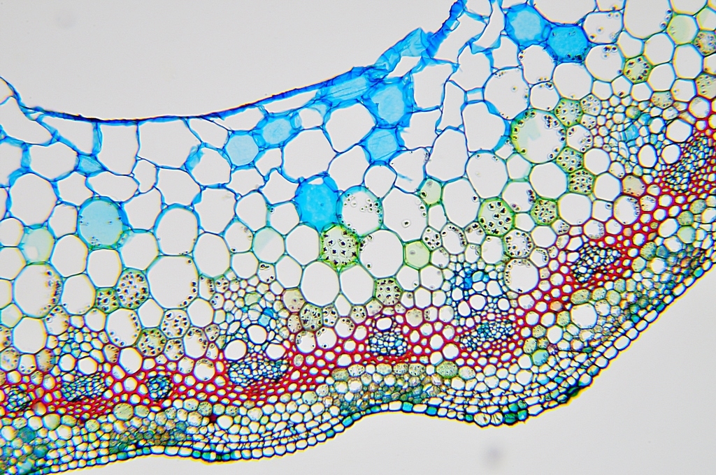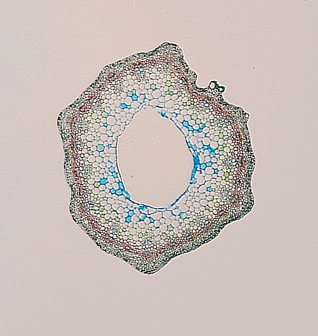 Zellwände blaugrün bis grün, verholzte Zellwände leuchtend rot, Zellwände der äußeren Hypodermis orangerot, Cuticula gelb, Zellwände der innenliegenden Hypodermis tiefrot.