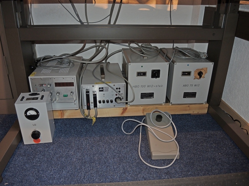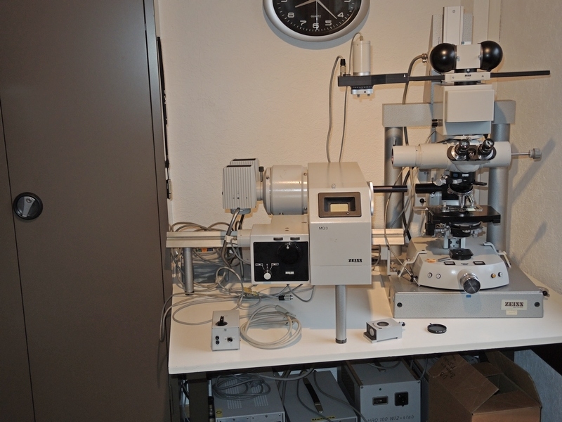 das ,,Mikrosköpchen" ist mit einem UV – Scanning – Mikroskop – Photometer, Differential – Interferenzkontrast – Einrichtung und mit einem Universal – Drehtisch (vierachsig) ausgestattet.