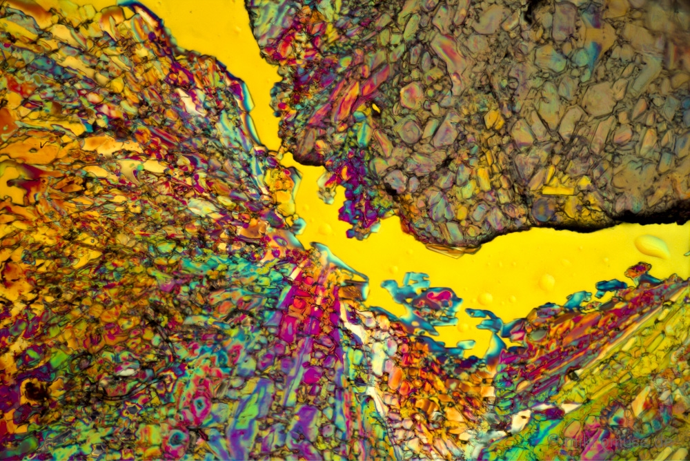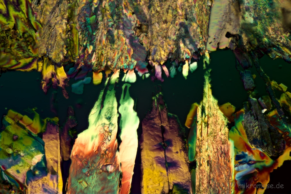 habe mal wieder fotografiert, gefilmt und vertont. Herausgekommen sind zwei Mini-Filme (4,5 und 5,5 Minuten lang), die ich hier vorstellen möchte. Habe herumgespielt mit Polarisation, überwiegend Durchlicht-Pol, bei einigen Aufnahmen auch mit Auflicht-Pol. Die verwendeten Substanzen waren Bittersalz, das war fast immer dabei, dann auch Zitronensäure und Spülmittel. Letzteres habe ich nicht wegen eventueller Pol-Effekt verwendet, sondern um einen flachen Lösungsfilm (Lösungsmittel Leitungswasser) zu erreichen, bevor die Proben auf einem 95 Grad Heizöfelchen direkt auf dem Objektträger ziemlich schnell (3-10 Minuten) zum Kristallisieren gebracht wurden.