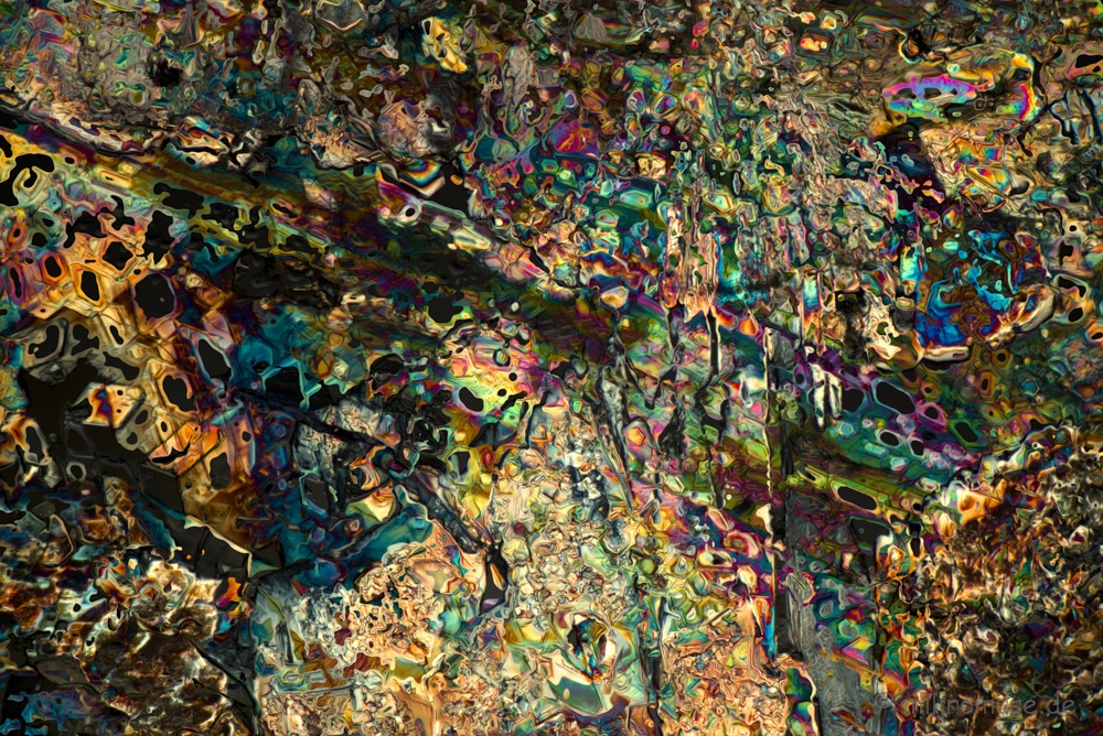 da ich kein DIC habe, kann ich nur schätzen, daß du einen Lambda/4 verwendet hast. Mit den von mir erwähnten Folien kommt man aber in die 2. oder 3.Ordnung, mit viel intensiveren Farben. Ich verwende oft ein Glimmerplättchen mit einem Gangunterschied um 1200nm.