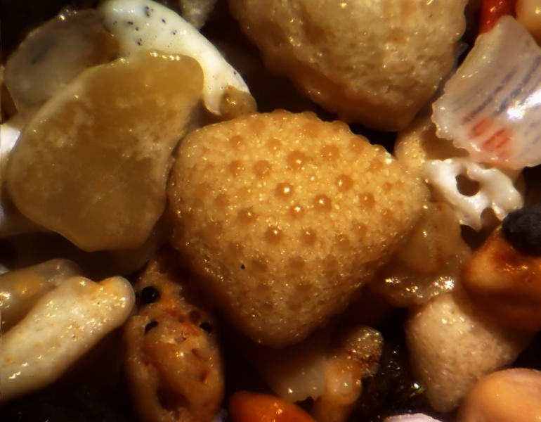 Das getüpfelte Objekt auf Bild 1 ist eine Foraminifere, Bild 2 ?, Bild 3 Ist ein Sklerit einer Lederkoralle,