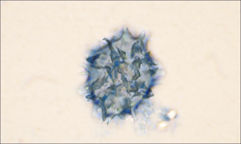 Die Pastete enthält eine andere Art, wage ich zu behaupten, da die ,,baumwollblaue Spore" (etliche waren schon gekeimt, einen kompletten Ascus konnte ich noch nicht finden) abweichend ornamentiert ist:
