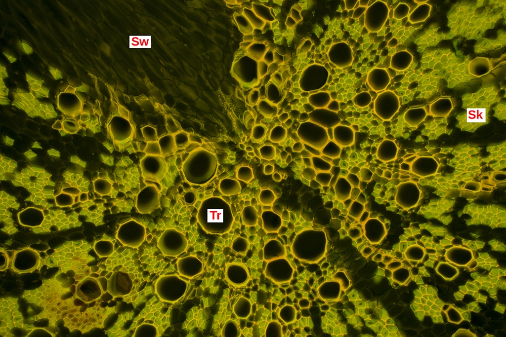 Nochmals sehen wir die Seitenwurzel (Sw), Tracheen (Tr) und verholzte Sklerenchymzellen. Die lignifizierten Zellen leuchten in einem hellen Grün/Gelb
