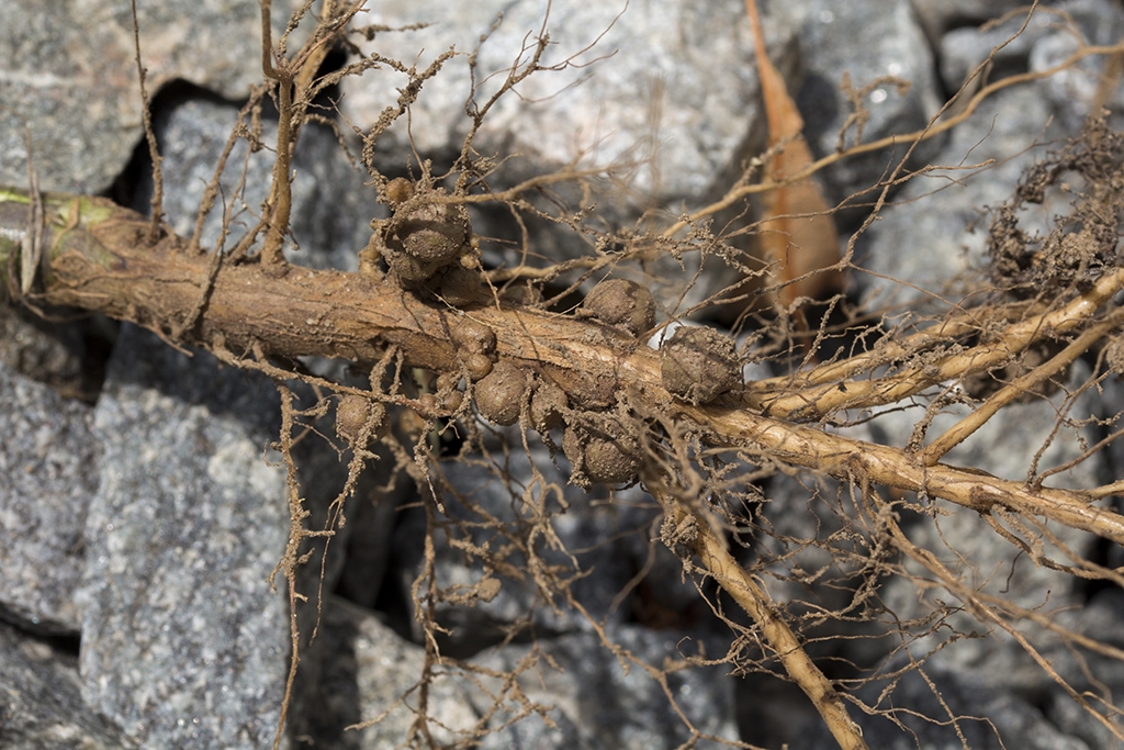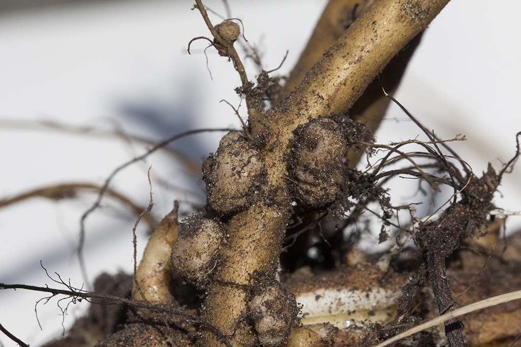 Deutlich jüngere und kleinere Knöllchen an der Pfahlwurzel der Sojabohne: