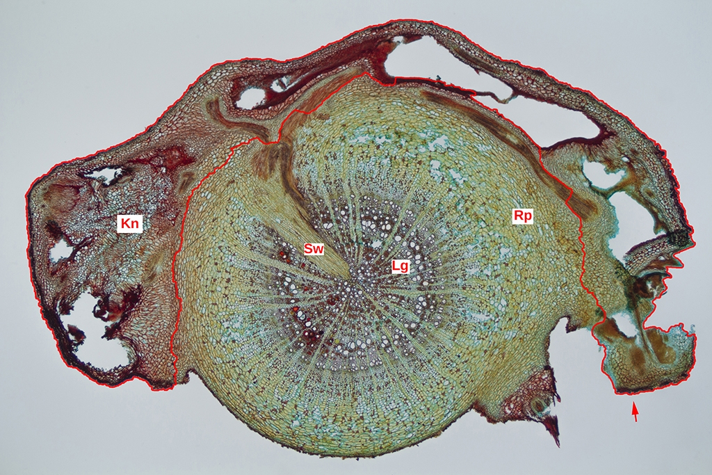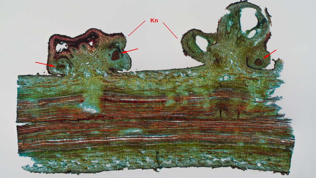 Zu sehen sind schräg angeschnittene Leitbündel die die Nährstoffversorgung der Knöllchen bilden.