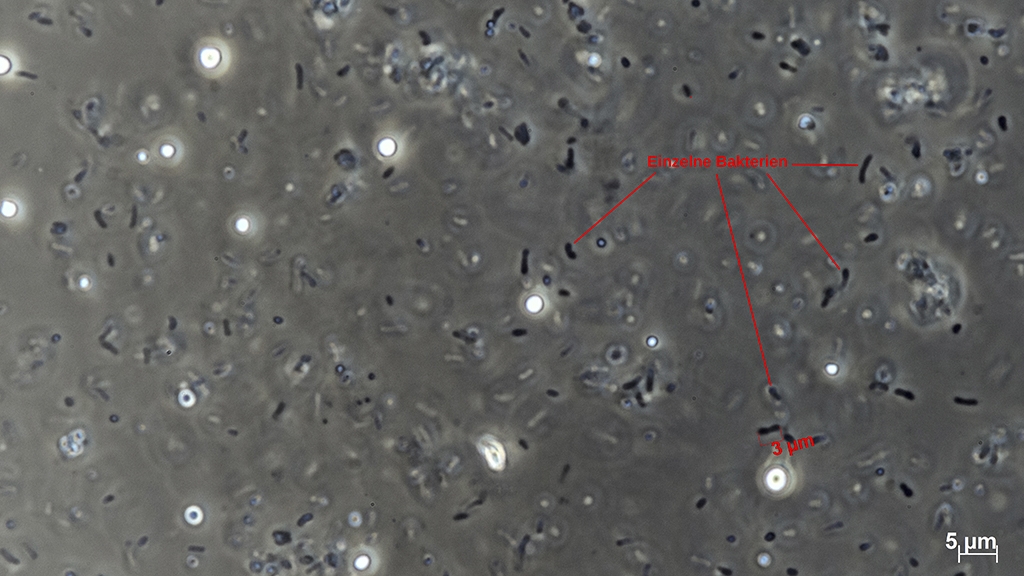 Zu sehen sind viele Bakterien mit einer Länge von ca. 3µm