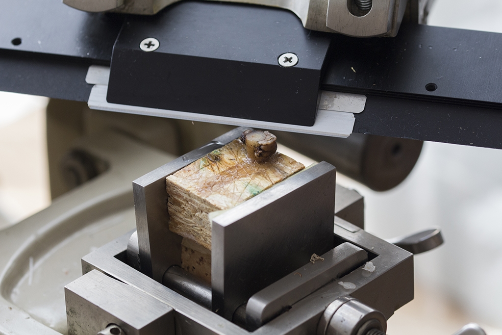 Eingespannte Probe im Mikrotom: