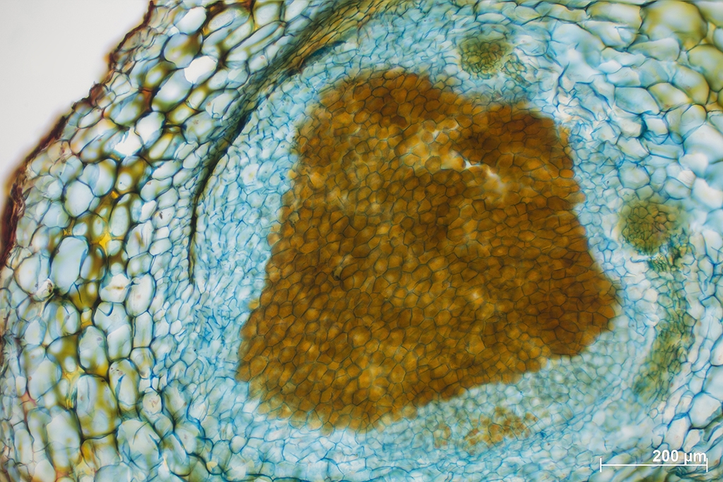 Bevor wir zu den mikroskopischen Aufnahmen kommen, möchte ich noch einen makroskopischen Querschnitt durch ein Knöllchen der Lupine zeigen: Eingekreist habe ich zwei Bereiche. Zunächst der rote Bereich der totes Gewebe des Knöllchens zeigt und dann den grünen Bereich der aktives, mit Rhizobien  besetztes Gewebe zeigt. Wenn man genau hinschaut sieht man im grünen Bereich eine rötliche Färbung des Gewebes. Diese deutet auf das Vorhandensein von Leghämoglobin hin. Dieser rote Blutfarbstoff ähnelt unserem Hämoglobin und hat auch dieselbe Funktion. Interessant ist, dass unser Hämoglobin aus dem Leghämoglobin hervorgeht! Das Leghämoglobin wird von der Pflanze synthetisiert und bindet überschüssigen Sauerstoff. Das Enzym Nitrogenase ist nämlich sehr sauerstoffempfindlich und kann nur unter Sauerstoffausschluss die Stickstofffixierung vollziehen.