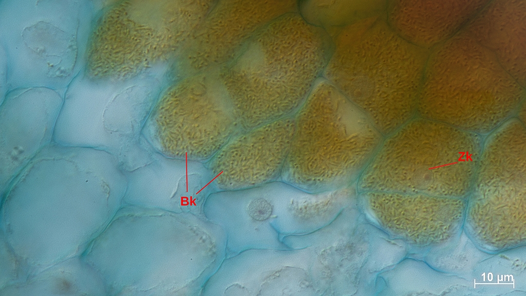 Das bräunlich gefärbte Oval beheimatet die Bakterien. Jede dieser Zellen sind voll mit Bakterien wie man im nächsten Bild gut sehen wird.