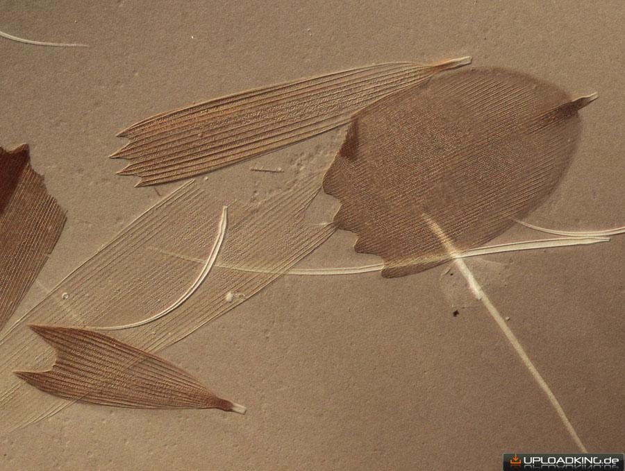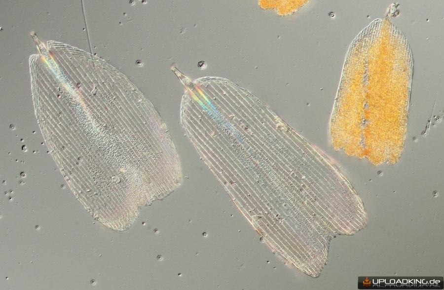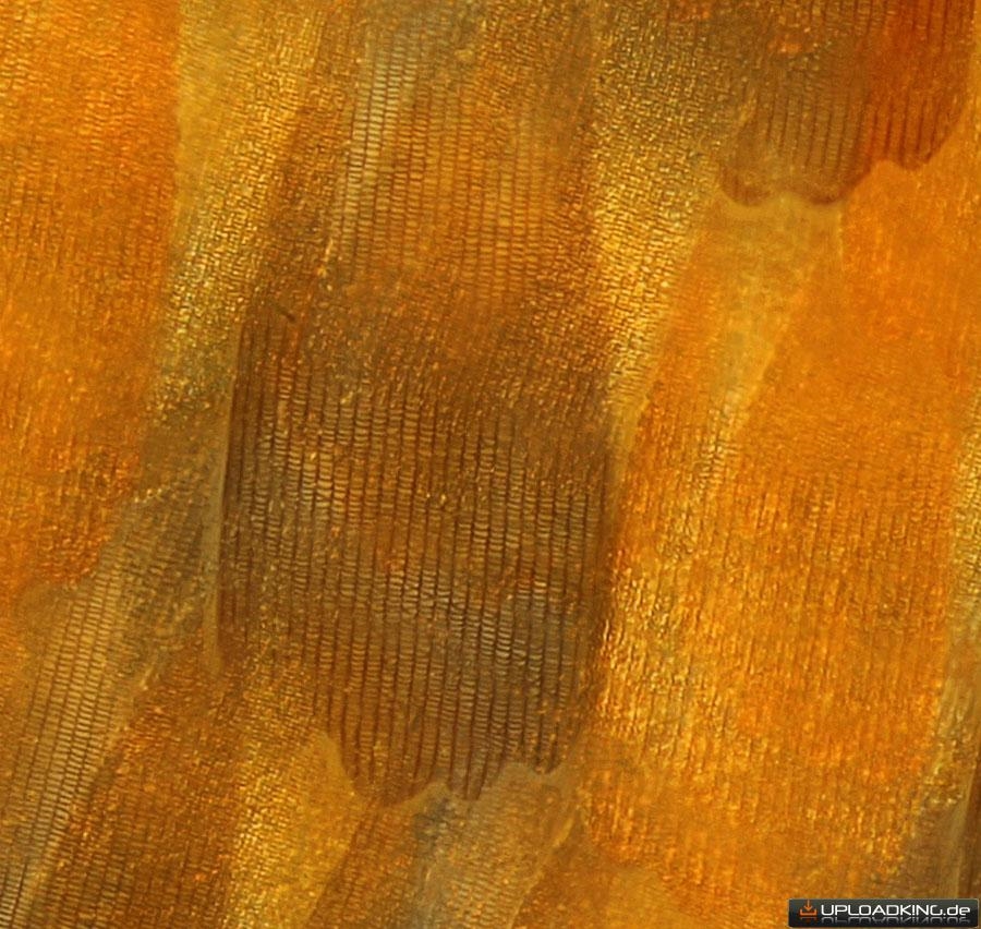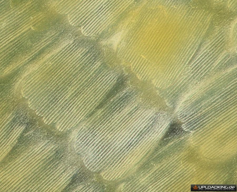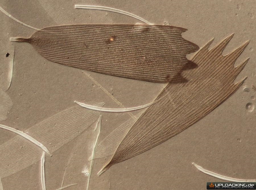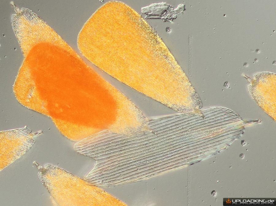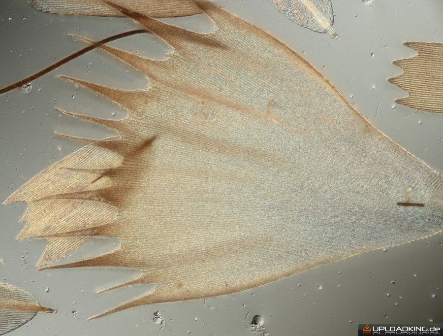 Wie schon in Annes Thread geschrieben ist bei mir bei der Herstellung und dem Transport der Dauerpräperate einiges schiefgegangen. Z.B. klebten die Präperate zusammen und der schwarze Eindecklack für die Ränder lloß in den Innenberech. Aus der Not habe ich eine Tugend gemacht und einfach die Schuppen im schwarzen Lack fotografiert/mikroskopiert: