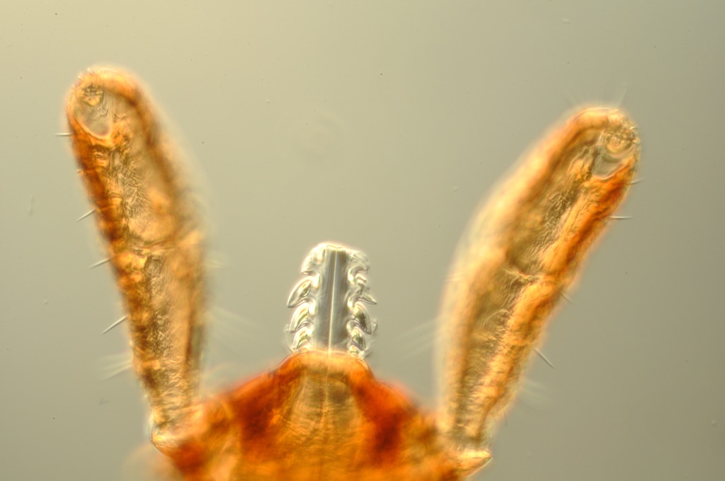 Leider fehlt bei einer Zecke ein Teil der Mundwerkzeuge.