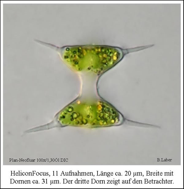 hier zwei Bilder einer Jochalge aus einer Gattung, die man zwar häufiger einmal findet, deren fotografische Darstellung mir aber auf Grund ihrer dreidimensionalen Struktur immer extreme Schwierigkeiten bereitet und nur selten zufriedenstellende Resultate ergibt. Ich hoffe, ich liege mit der Bestimmung als Staurodemus cuspidatus (in der älteren Literatur Staurastrum cuspidatum) richtig. Die Alge stammt aus dem moorigen Nonnenmattweiher in der Nähe von Badenweiler am Westrand des Schwarzwaldes.