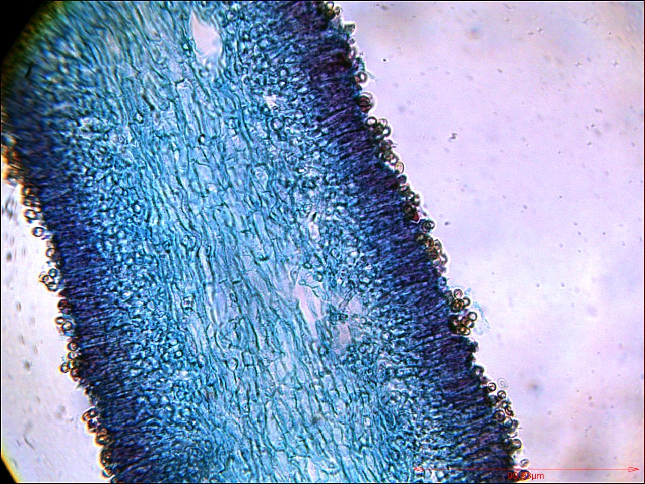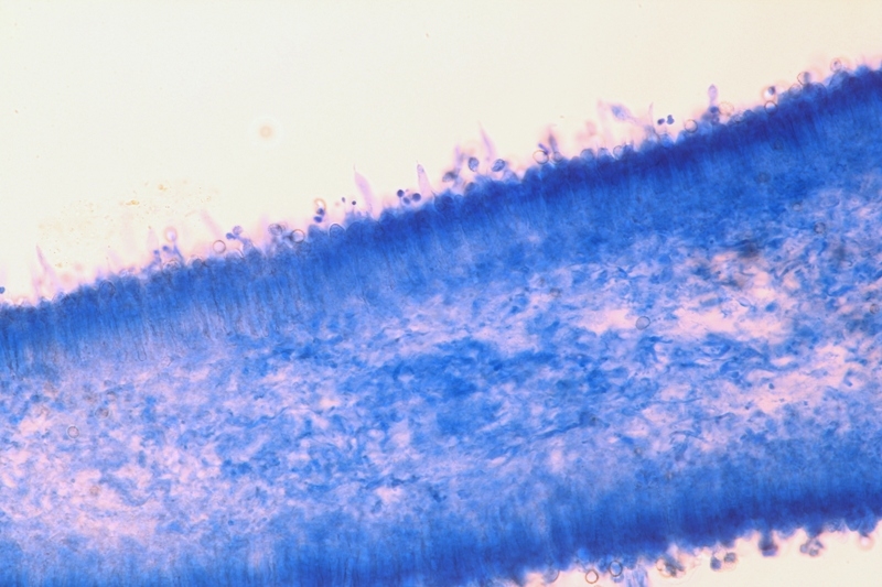Russula olivacea, ein Täubling, Lamellenschnitt, gefärbt mit Baumwollblau, in Euparal. Zystiden und Sporen blieben einigermaßen erhalten.