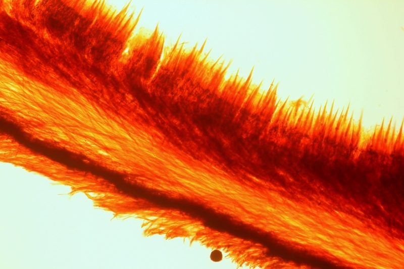 Eine Hymenochaete-Art, Fruchtkörperquerschnitt, die sehr festen Zystiden, Haare und Skeletthyphen sind nicht totzukriegen, der Rest kaum zu erkenen und deformiert, unfixiert, Euparal.