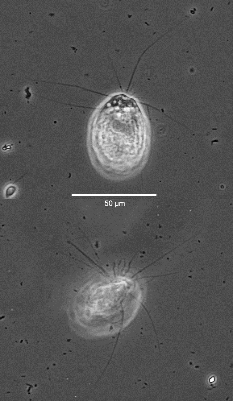 PS: Messbalken ergänzt. Die Aufnahmen wurden mit einem Phasenkontrast Objektiv 40/0.75 Ph2 aufgenommen. Es handelt sich um zwei verschiedene Individuen in der gleichen Probe, die ich zwischen Fäden von Spyrogyra fand.