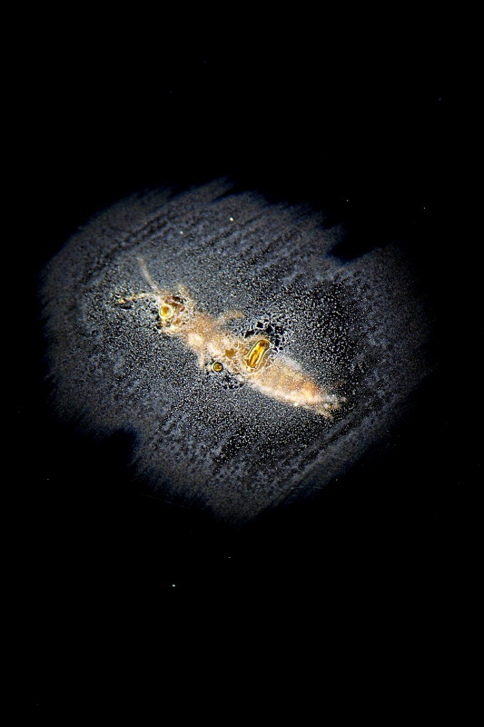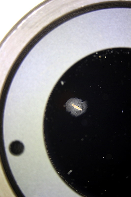 alles ist möglich, auch Viechzeugs, das blöde Schatten wirft. So bei einem sonst tadellosen Tritubus von Leitz. Die Fehlersuche: Augen abwechselnd zukneifen hat schon mal die Okulare ausgeschlossen. Tubus drehen---> Schatten dreht mit führte zur Tubuslinse. Und die hat Erstaunliches gezeigt: da ist innen ein Insekt verendet und hat sein Leben buchstäblich ausgehaucht, wie der Tröpfchenschleier zeigt. Die Tubuslinse lässt sich mit einem Stirnlochschlüssel leicht herausschrauben und so wird das winzige Insekt (ca 1 mm) schön sichtbar. Ich tippe auf einen Thrips. Ich hoffe auf Manfreds Zustimmung! ;)
