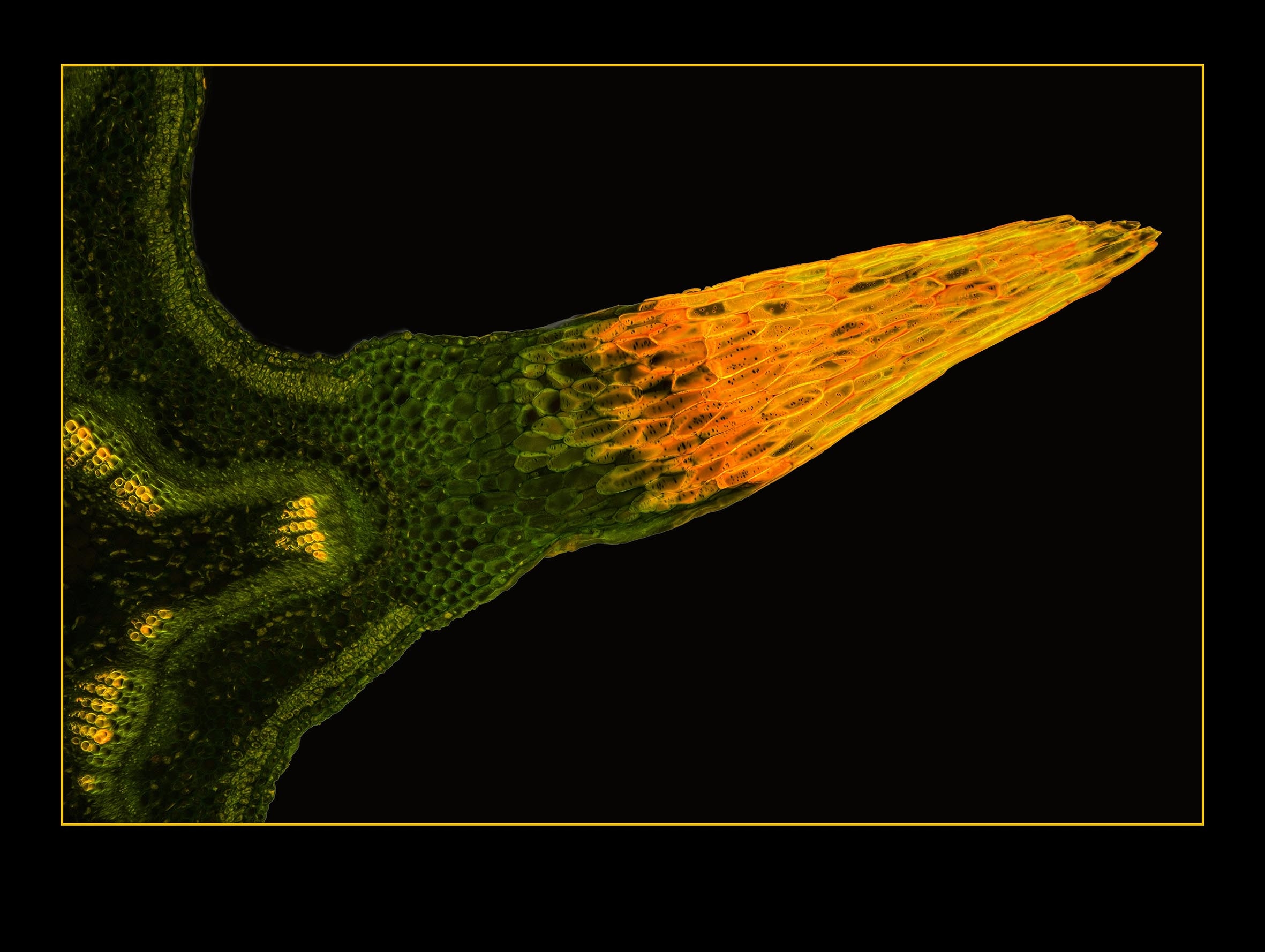 Zellwände blaugrün bis grün, verholzte Zellwände leuchtend rot, Zellwände der äußeren Hypodermis orangerot, Cuticula gelb, Zellwände der innenliegenden Hypodermis tiefrot.