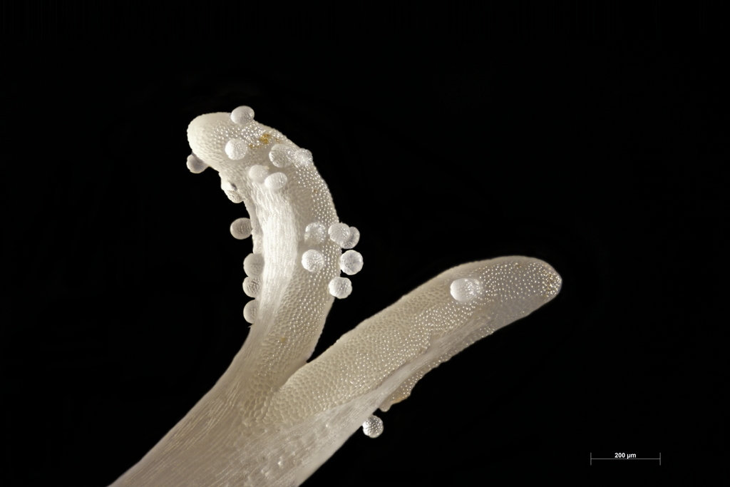 Der Griffel einer Basilikumblüte mit anhaftenden Pollen.