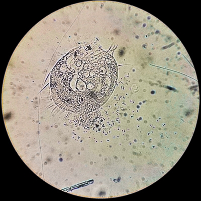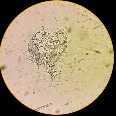 Was ist hier passiert? Konnte der Euplotes mit seinen Vakuolen nicht mehr den Zellmembrandruck aufrecht erhalten? Während der ganzen Zeit konnte ich keinen "Puls" mehr sehen (im Sinne einer pulsierenden Vakuole). Hat der Euplotes einfach das Ende seines Lebens erreicht, oder stimmten hier Umweltbedingungen auf dem Hohlschliffobjektträger nicht? Handelt es sich sozusagen um ein euplotisches Herzversagen?