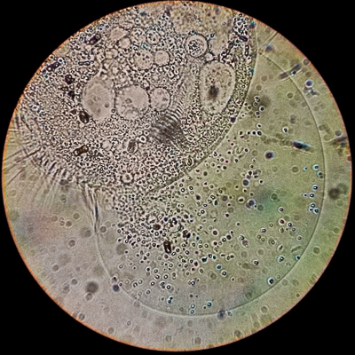 Da ich den oben gesehenen Euplotes ja schon kurz nach dem Auflegen gefunden habe, könnte es aber vielleicht auch sein, dass er beim Umsetzen mit der Pasteurpipette oder durch den Schlag beim Auflegen des Deckgläschens verletzt wurde? In Bild 1 ist die Zellwand ja schon lädiert.