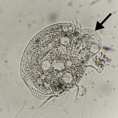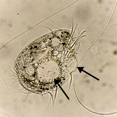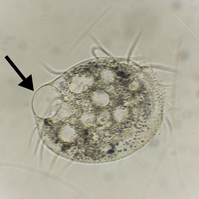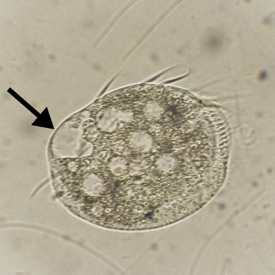 Im ersten Bild sieht man einen Euplotes, bei dem sich die Hülle schon leicht deformiert, weil die Vakuole Platz braucht. Dieses Mal jedoch ist der Euplotes nicht ersichtlich äußerlich verletzt: