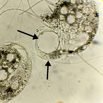 Mit dem 40er Objektiv habe ich mal ins Detail der ersten Blase geschaut, wie hier nach und nach Plasma der Zelle in die Blase ausströmt: