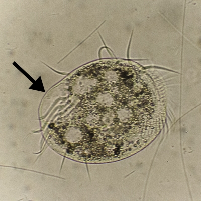 An einer Stelle hat sich eine Art Blase gebildet, in die kontinuierlich Plasma einströmt. Der Rand der Blase ist ganz fein und zunächst erschien diese fast leer zu sein, abgesehen von den ersten Körnchen. Die vorderen Geißeln haben sich zu diesem Zeitpunkt noch rasch bewegt, die hinteren Schwanzgeißeln hingegen waren schon größtenteils wie "gelähmt". Der Euplotes selbst hat sich keinen Mikrometer bewegt. Da ich mir das Bild nicht erklären konnte, bin ich ein wenig dran geblieben.