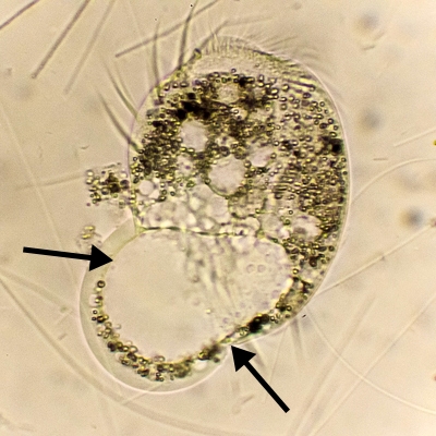 gestern habe ich in einer weiteren Probe drei weitere Exemplare der Gattung gefunden, von denen zwei auch so ein "Super-Vakuuole" Problem hatten: incl. Ausstülpungen des Körpers, die teilweise sehr gruselig aussahen. Diesmal konnte ich den Vorgang genauer beobachten, in einem Zustand, da die Zellen unverletzt sind: dass sich eine der Vakuolen entsprechend immer weiter füllte und so zur Deformation der Hülle führte.