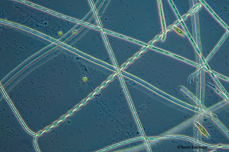 Die Fäden (Trichome) der Gattung Oscillatoria schwingen häufig aktiv hin und her.