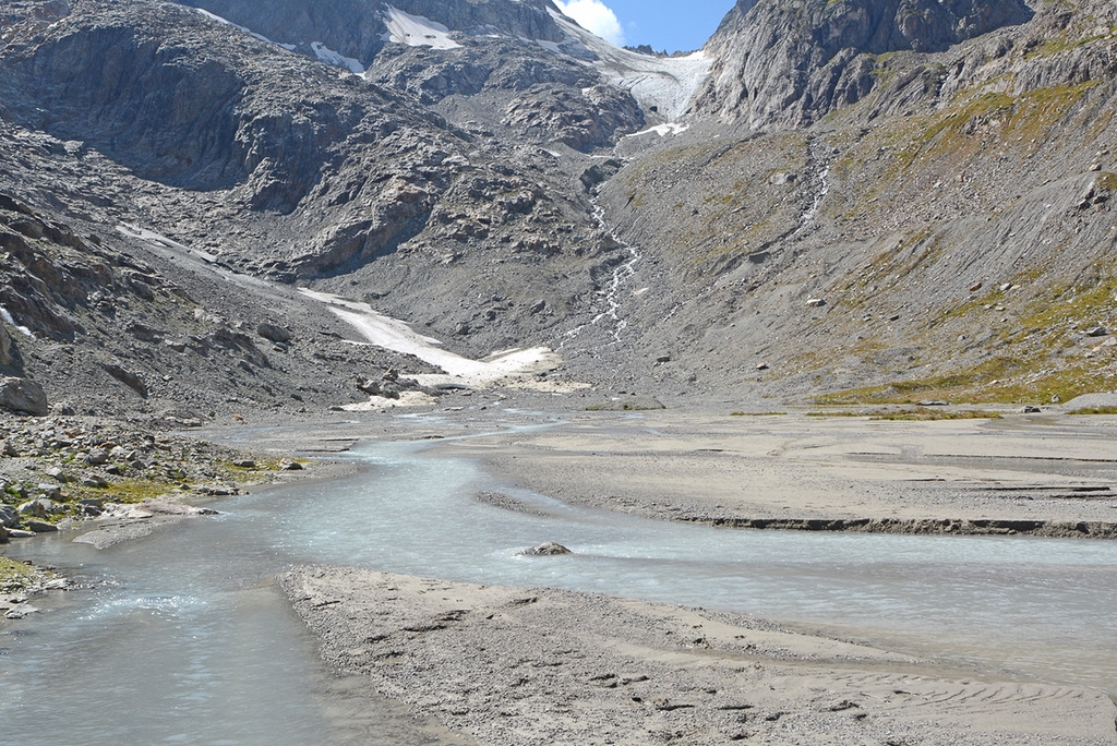 mäandernder Gletscherbach der immer wieder sein Umfeld überschwemmt