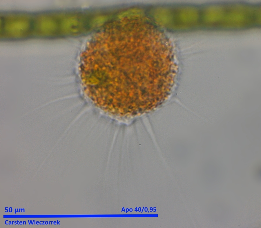 Carstens Fund zeigt Filopodien und das typische granuläre, rötliche Plasma von Vamyrella. Zu sehen ist die Schwebeform, für die die radial ausgestreckten, relativ bewegungslosen Filopodien typisch sind.