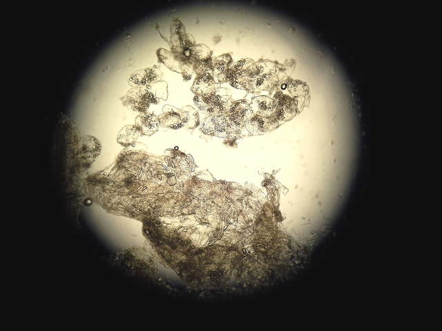 Habe später mit Freude festgestellt, dass es doch möglich ist ein Bild mit meiner alten Samsung Tablett zu schießen (wackerlige Angelegenheit!), was einigermaßen das Objekt zeigt. Heute morgen dann in Kremer's Buch nachgeschaut was diese tausenden kleinen Kernen sind: Stärke.