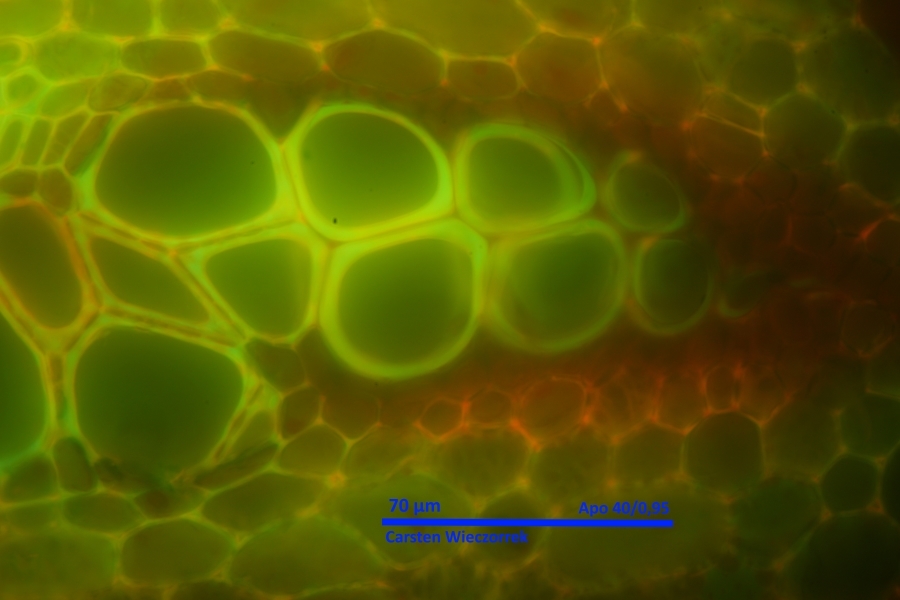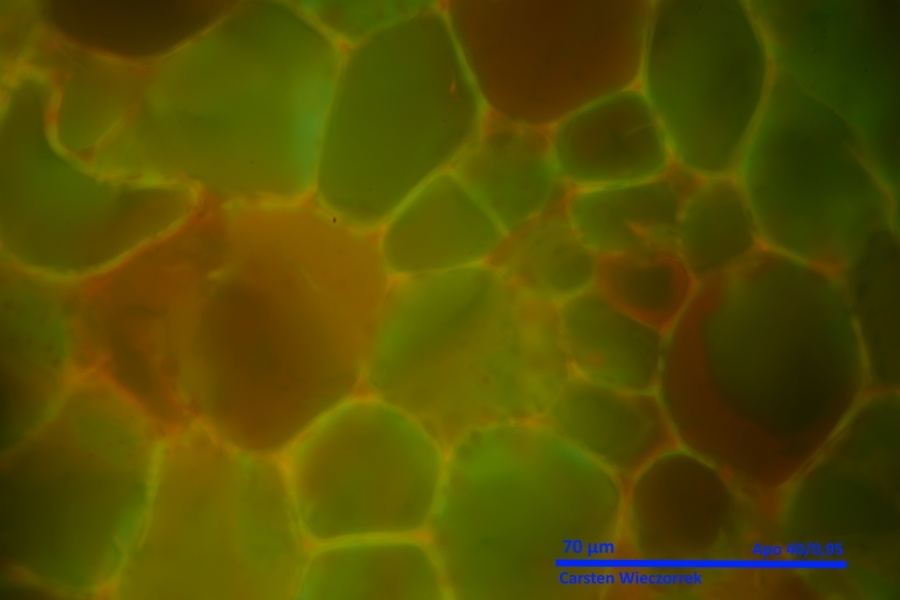 Für die Fluoreszenzaufnahmen wurde Auflicht einer 3 Watt 430 nm LED verwendet. Gefiltert wurde mit dem CZJ-Filterwürfel 450-3 (enthält Anregungs- und Sperrfilter). Zusätzliche Anregungs- und Sperrfilter wurden nicht verwendet.
