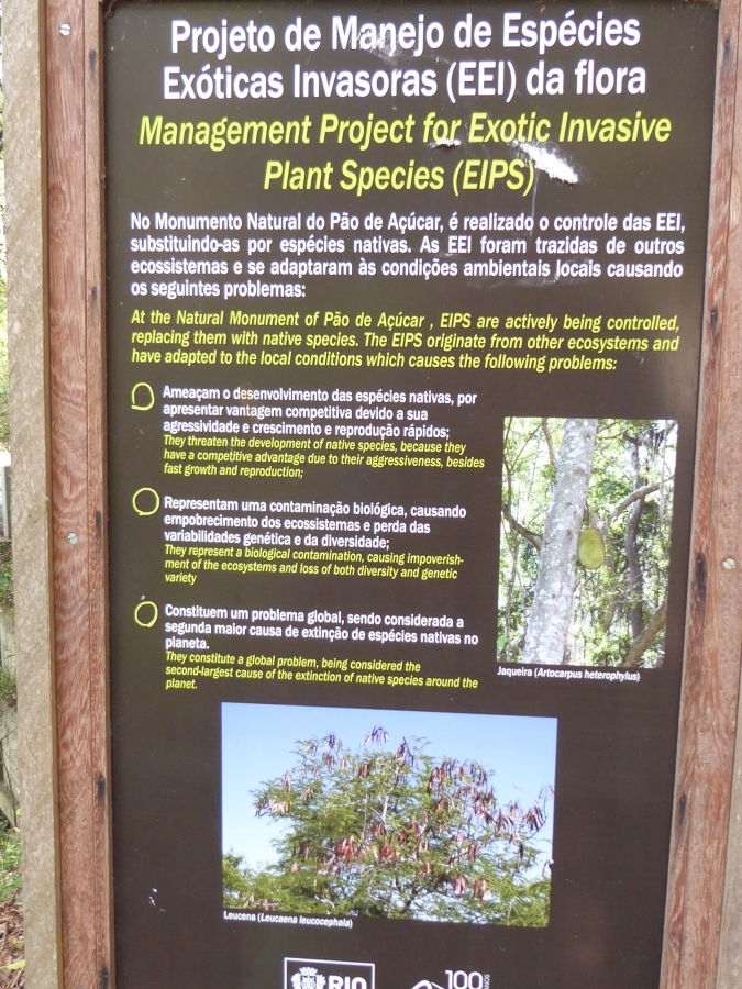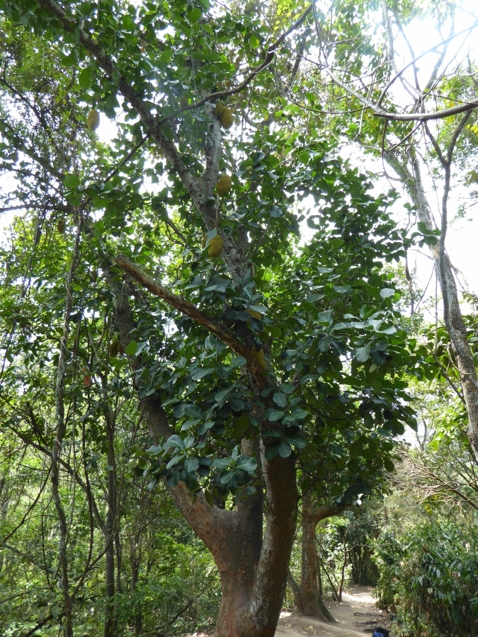 Kultiviert wird der Jackfruchtbaum in allen tropischen Gebieten der Welt. In Brasilien gilt er als invasiver Neophyt und wird von den Forstbehörden bekämpft. Jedenfalls in unmittelbarer Nähe der ehemaligen Olympia-Spielstätten: Rund um die Copacabana sind Informationstafel aufgestellt, die in portugiesischer und englischer Sprache über die Gefahren schnell wachsender Neophyten informieren. Mitarbeiter der Forstverwaltung entrinden dort alle Jackfruchtbäume in etwa 30 cm Höhe auf etwa 50 cm Breite (siehe Bild 5). So soll der Baum vor Ort eingehen und verrotten. Das funktioniert auch ganz gut, aber schon 5 km vom Zuckerhut entfernt habe ich keine Schälungen mehr gesehen, die Bäume gedeihen dort prächtig.