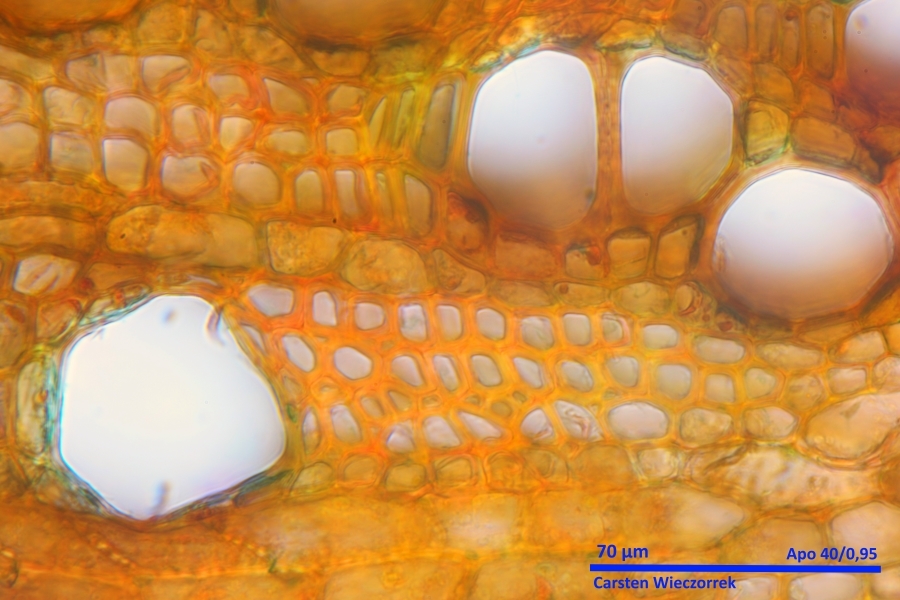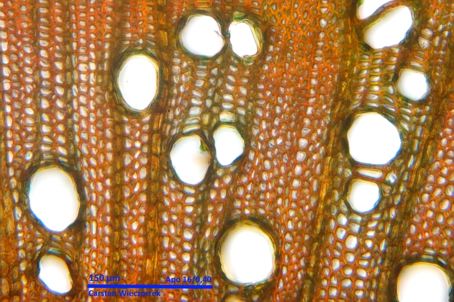 Die Jackfrucht gehört zu den Proben, bei denen mir das AFE ausgegangen ist. Möglicherweise hat das Ästchen etwas gelitten, da es ca. 4 Stunden trocken in meinem Rucksack zubringen musste. Im Hotel wurde es sofort in Cachaca gelagert. Erst 4 Tage später konnte es in AFE eingelegt werden. Dort hat es jetzt etwa 2 Wochen verbracht. Geschnitten habe ich auf dem Handmikrotom mit Leica-Einmalklingen im SHK-Klingenhalter. Die Schnittdicke beträgt rund 30 µm. Das Material ließ sich gut schneiden.